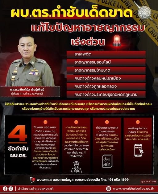 ตามที่ รัฐบาล และสำนักงานตำรวจแห่งชาติ ( ตร. ) มีนโยบายเร่งด่วน ในการแก้ไขปัญหายาเสพติด อาชญากรรมออนไลน์ อาชญากรรมข้ามชาติ คนต่างด้าวหลบหนีเข้าเมืองโดยผิดกฎหมาย และคนต่างด้าวถูกหลอกลวงหรือประกอบธุรกิจผิดกฎหมาย ตลอดจนการป้องกันปราบปรามคนต่างด้าวที่เข้ามาในลักษณะที่แอบแฝงหรือกระทำความผิดในลักษณะที่เป็นภัยต่อสังคม หรือจะก่อเหตุร้ายให้เกิดอันตรายต่อความสงบสุขหรือความปลอดภัยของประชาชน หรือความมั่นคงแห่งราชอาณาจักร อันส่งผลต่อภาพลักษณ์หรือประสิทธิภาพในการบังคับใช้กฎหมายของสังคมโดยรวม