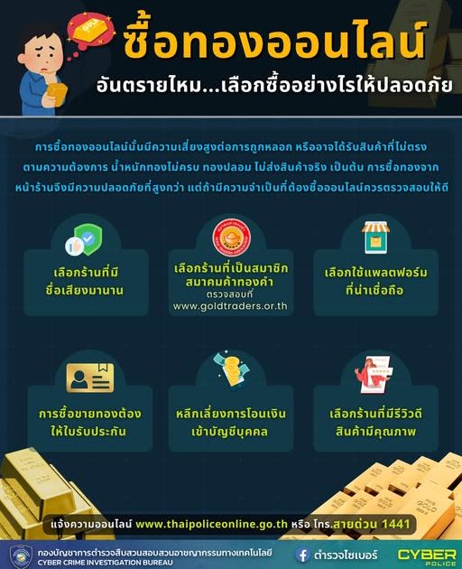 การซื้อทองออนไลน์นั้นมีความเสี่ยงสูงต่อการถูกหลอก หรือโกงจากมิจฉาชีพ การซื้อทองจากหน้าร้านจึงมีความปลอดภัยที่สูงกว่า แต่ถ้ามีความจำเป็นที่ต้องซื้อออนไลน์ควรตรวจสอบให้ดี ดังนี้