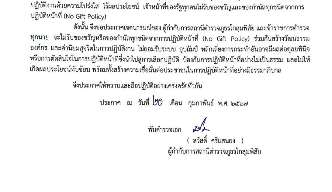 ประกาศเจตนารมณ์ที่จะไม่รับของขวัญหรือของกำนัลทุกชนิดจากการปฏิบัติหน้าที่ (No Gift Policy)