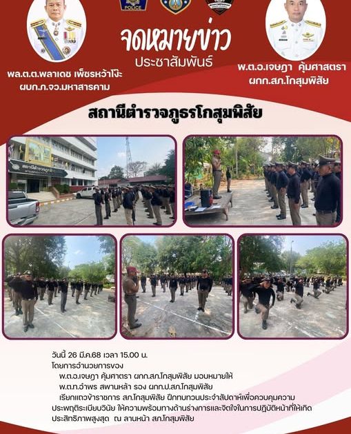 เรียกแถวข้าราชการ สภ.โกสุมพิสัย ฝึกทบทวนประจำสัปดาห์ เพื่อควบคุมความประพฤติระเบียบวินัย ให้ความพร้อมทางด้านร่างการและจิตใจในการปฏิบัติหน้าที่ให้เกิดประสิทธิภาพสูงสุด ณ ลานหน้า สภ.โกสุมพิสัย