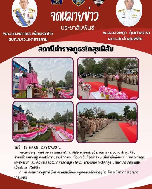 พร้อมด้วยข้าราชการตำรวจ สภ.โกสุมพิสัย ร่วมพิธีวางพานพุ่มดอกไม้ถวายราชสักการะ เพื่อรำลึกถึงพระมหากรุณาธิคุณแห่งพระบาทสมเด็จพระจุลจอมเกล้าเจ้าอยู่หัว เนื่องในวันท้องถิ่นไทย
