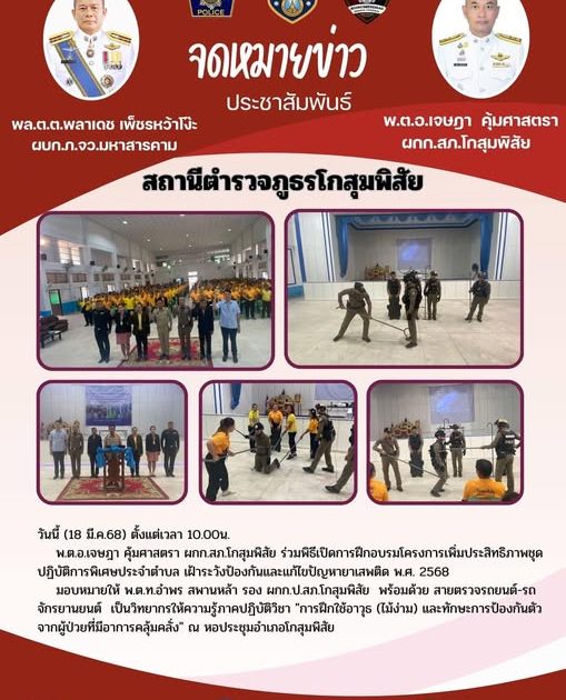 มอบหมายให้ พ.ต.ท.อำพร สพานหล้า รอง ผกก.ป.สภ.โกสุมพิสัย พร้อมด้วย สายตรวจรถยนต์-รถจักรยานยนต์ เป็นวิทยากรให้ความรู้ภาคปฏิบัติวิชา “การฝึกใช้อาวุธ (ไม้ง่าม) และทักษะการป้องกันตัวจากผู้ป่วยที่มีอาการคลุ้มคลั่ง” ณ หอประชุมอำเภอโกสุมพิสัย