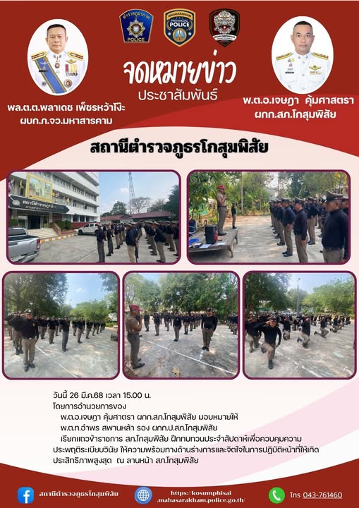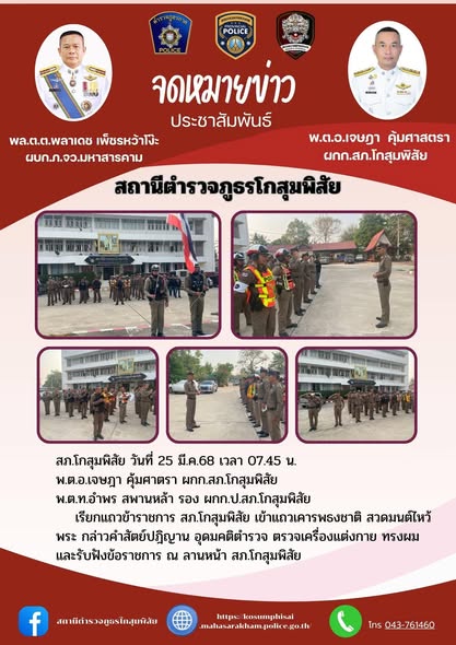 วันที่ 25 มี.ค.68 เวลา 07.45 น. พ.ต.อ.เจษฎา คุ้มศาตรา ผกก.สภ.โกสุมพิสัย พ.ต.ท.อำพร สพานหล้า รอง ผกก.