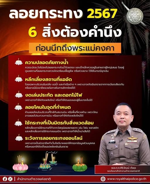 ดังนั้น เพื่อให้เทศกาลลอยกระทงเป็นไปอย่างปลอดภัย สนุกสนาน และไม่ทำลายสิ่งแวดล้อม สำนักงานตำรวจแห่งชาติจึงขอแนะนำ 6 สิ่งที่ต้องคำนึง ในช่วงเทศกาลลอยกระทง ดังนี้