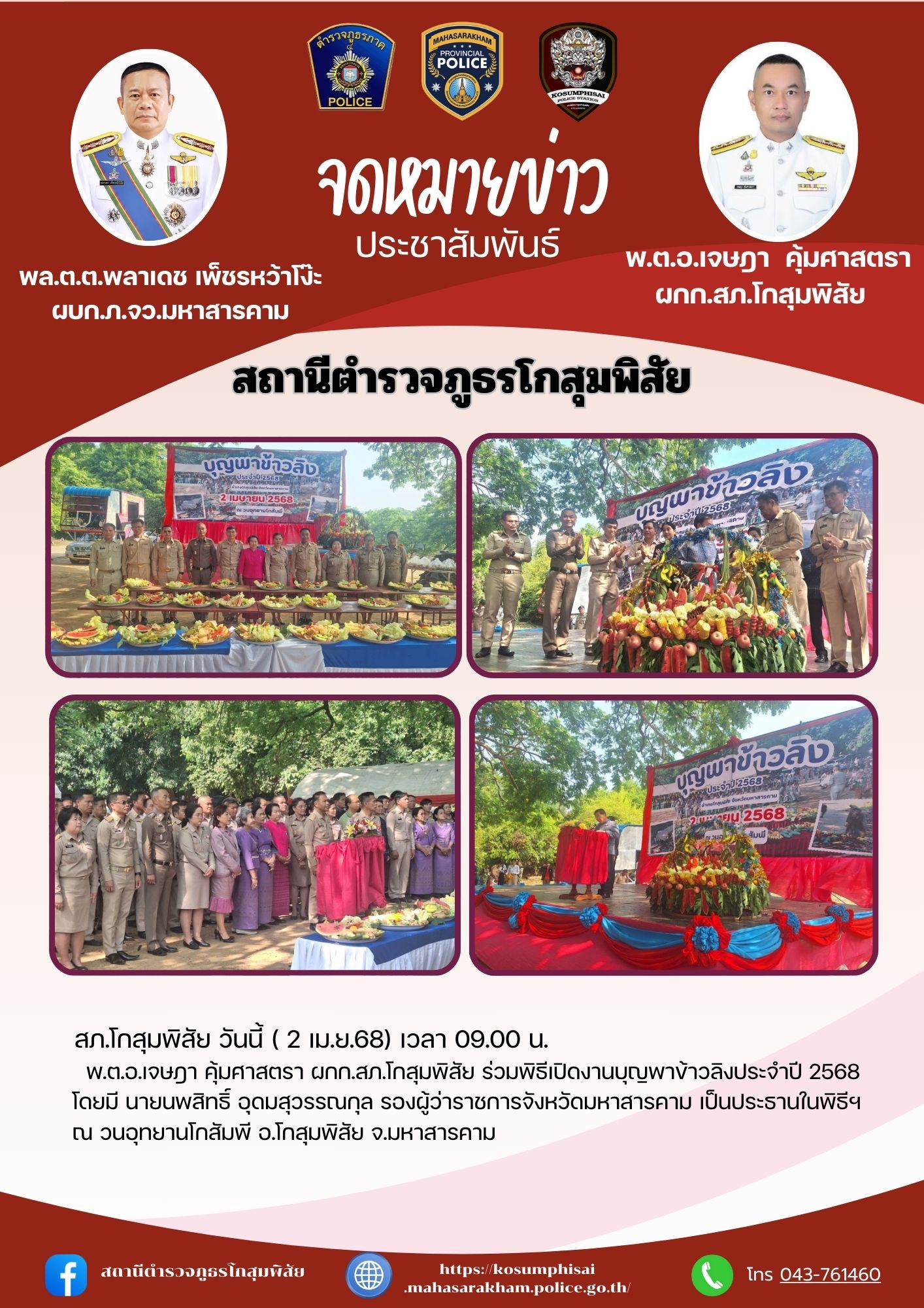 วันนี้ ( 2 เม.ย.68) เวลา 09.00 น.พ.ต.อ.เจษฎา คุ้มศาสตรา ผกก.สภ.โกสุมพิสัยร่วมพิธีเปิดงานบุญพาข้าวลิง