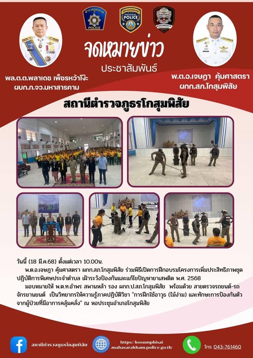 วันนี้(18 มี.ค.68) ตั้งแต่เวลา 10.00น.พ.ต.อ.เจษฎา คุ้มศาสตรา ผกก.สภ.โกสุมพิสัยร่วมพิธีเปิดการฝึกอบรม