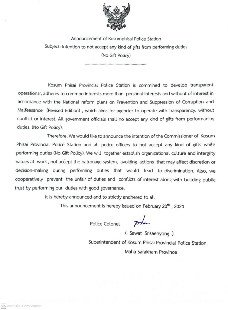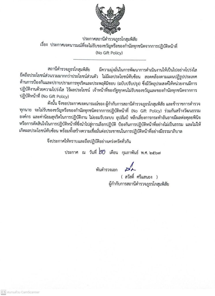 เรื่อง ประกาศเจตนารมณ์ที่จะไม่รับของขวัญหรือของกำนัลทุกชนิดจากการปฏิบัติหน้าที่